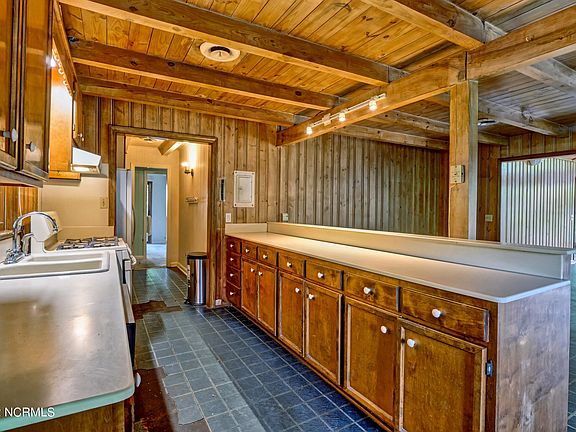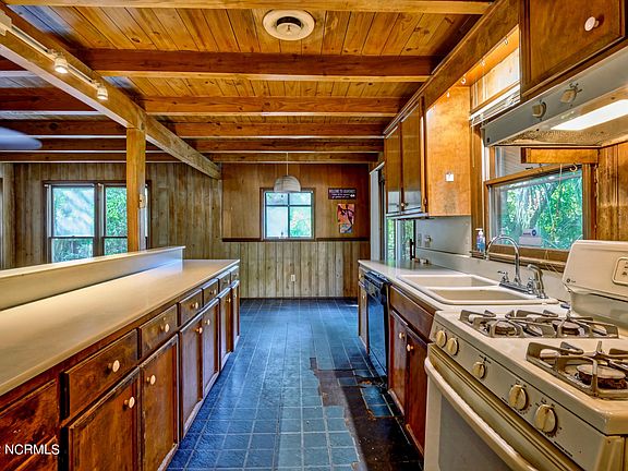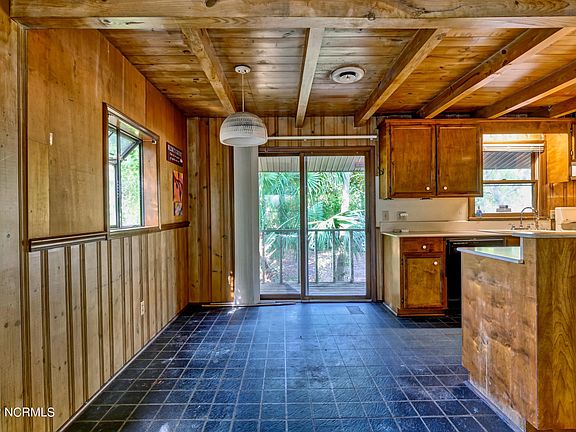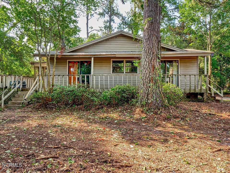 Location and Charm! This Classic Mid-Century Beach Cottage, which originally sat atop a waterfront site on Wrightsville Beach, is a very solid build, boasting many period features. Enjoy warm solid pine shiplap ceiling boards, exposed pine beams, and Pickwick Knotty pine wall paneling throughout the home. Kick back and enjoy a book, occasionally glancing out the large bank of window that wrap the side and exterior of the expansive and open concept primary living space. The kitchen has ample storage space with solid wood cabinetry, Hard surface resin countertops, Dishwasher, Gas Range, Range hood, Double bowl ceramic sink with stainless hardware. Whirlpool refrigerator and washer and dryer to remain. Ceiling fans throughout the home. A part of this homes Coastal Cottage character is a wraparound porch from the left side of the home extending around to the rear of the home to an open deck area and a large, covered screened in rear porch. The roomy Master suite has a sliding door to the rear screened porch and an en-suite bath. Two of the other three guest rooms also have sliders to the porch. There is a full shared bath in the hall way. The home sits atop a large, wooded .39 Acre wooded lot. There is a small storage building in the rear and a well house and pump house. Well water was previously used for irrigation but is not currently operational. New roof was installed in 2017. With a creative eye and some updating here and there, this well built home can be restored to its originally designed cozy, classic Coastal Cottage style to enjoy for years to come. Incredible location, near the corner of Oleander and Greenville loop, it is an ideal location in close proximity to Wrightsville Beach, Mayfair and Independence Mall area with a wealth of shopping and dining choices. The home is located within the highly sought after Bradley Creek, Roland Grise, and Hoggard School District.