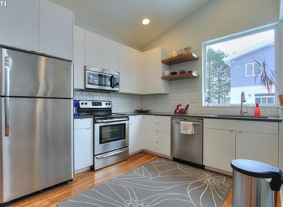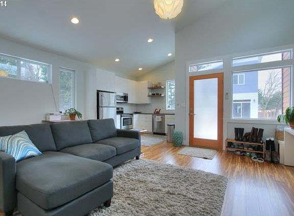 Brand New Custom Built Bright Open 1BD 1BA Cottage! Bamboo floors, vaulted ceilings, SS appliances, custom flat panel cabinetry. Earth Advantage Platinum. Stand alone condo part of future 6 unit development with 6000 sqft of common open space. Encourages a sense of community through shared open space. Exciting Project and great location with low HOA Dues! Blocks to Woodstock village & future New Seasons. www.woodstockgardens.