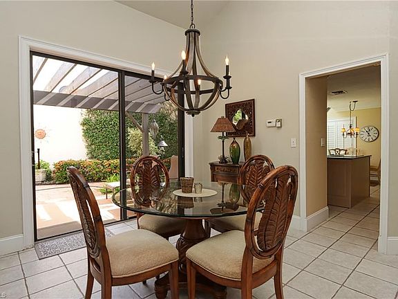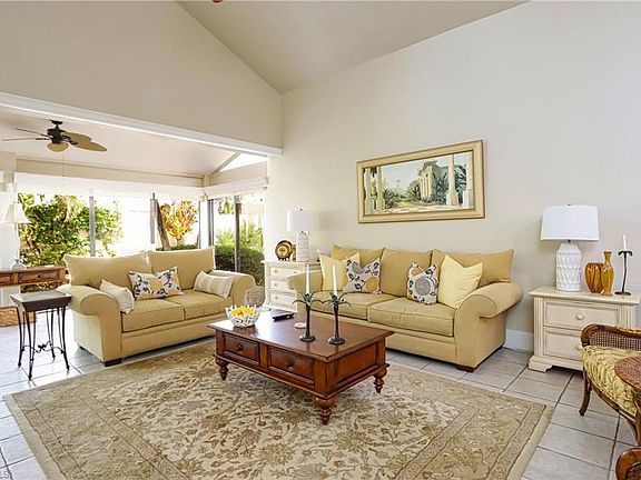 Absolutely immaculate single family pool residence located within one of Naples' most desirable communities! Enjoy the complete privacy in the enclosed sunny courtyard patio while lying poolside or entertaining. Pristine condition throughout with solid surface flooring in all living areas with light beige carpeting in the master bedroom and one guest bedroom. Soaring & volume ceilings in all rooms give the feeling of even more expansive living space. Split floor plan offers privacy to all guests. The living room combination consists of a sofa, loveseat & two chairs. The wood dining room table seats four plus there is a four person dinette in the eat-in kitchen. An extra enclosed intimate seating area featuring two oversized sitting chairs is also located just beyond the living room. Every creature comfort has been provided to make a tenant's stay more convenient and enjoyable. Enjoy the world class amenities of Pelican Bay including two private casual beachfront restaurants, beach shuttle, beach chair & umbrella set-up service, tennis club (pay per play), community fitness center, walking trails and more.
