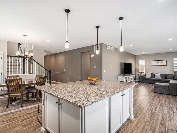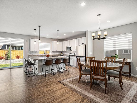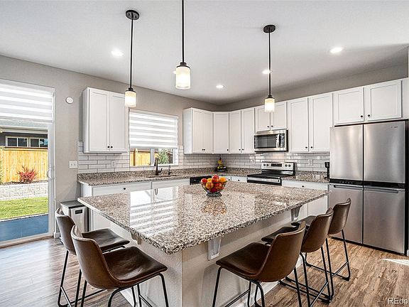 Welcome to this gorgeous 4-bedroom, 4-bathroom, 2-story home nestled in the desirable Mayfield community. Built in 2021, this beautifully maintained residence offers a bright, open floor plan with high ceilings and stylish laminate flooring throughout the entire home. The spacious kitchen is a chef’s dream, featuring a walk-in pantry and an oversized granite island with seating, perfect for casual meals and entertaining. The main floor also features a sunny, private home office. Upstairs, you'll find a convenient upper-level laundry room, a large loft space, a generous primary suite with a roomy walk-in closet plus 3 large secondary bedrooms, one with its own private full bathroom. Step outside to your beautifully landscaped backyard, ideal for summer entertaining. The home is perfectly positioned with a southern-facing orientation for abundant natural light. Located just down the street from a great community park. Close to schools, shopping, and dining options. This home also offers easy access to DIA and downtown Denver. Move-in ready with modern upgrades, this is a rare opportunity to own a stunning home in a prime location.