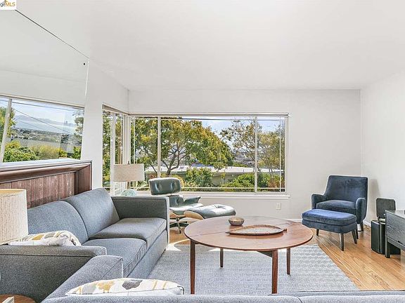 Spacious Mid-Century set above the street - offering privacy, views and a bright, open floor plan with great flow. This is a fantastic home for entertaining! Two spacious bedrooms, charming original bath, and half bath off of the large, eat-in kitchen. Sliding glass doors connect the kitchen to the patio and give easy access to BBQ and outdoor dining. Professionally landscaped yard is filled with drought tolerant plants on a drip irrigation system. Beautiful wood floors throughout, with random plank oak in the living room. New HVAC system with central heat and air conditioning. Unique, large L-shaped lot, with big 2-car carport and extra-long driveway which provides level-in access to house. Located in the hills of El Cerrito, yet convenient to transportation, parks, shopping and restaurants.