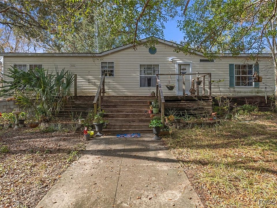 Freedom awaits at this 2 bedroom, 2 bathroom hilltop manufactured home on acreage with an in-ground pool. Property is located in a non-HOA neighborhood on a quiet paved dead end county road that is dotted with well-maintained homes on acreage. Conveniently located to Ocala, Dunnellon, and Lecanto. This 7.48 acre property affords plenty of room for accessory structures, animals, gardens, and toys. At one time the property contained 17 miniature horses. The parcel of land also backs up to 417 vacant acres. A long winding driveway brings you up to the home where there is a concrete parking pad. The large front deck greets you as you enter the home. Once inside space abounds as you walk into the open concept dining and living areas. French doors open up to the screen enclosed marcite pool and paver pool deck. The large kitchen provides plenty of counter and cabinet space along with an eat-in kitchen. The spacious primary bedroom contains an adjoining private primary bath with dual vanity and a separate tub and shower. The split plan design contains a sizeable second bedroom with ample closet space. Also, a large chain-link fenced dog run adjoins the side of the home. Majority of property, including the homesite, is located in Flood Zone X where no flood insurance is required. One-owner home has been lovingly maintained by its long-time owner, but is in need of some updating and TLC. New roof in 2022 and new pool pump in 2024. Preferred lender financing available with as little as 5% down, subject to credit approval.