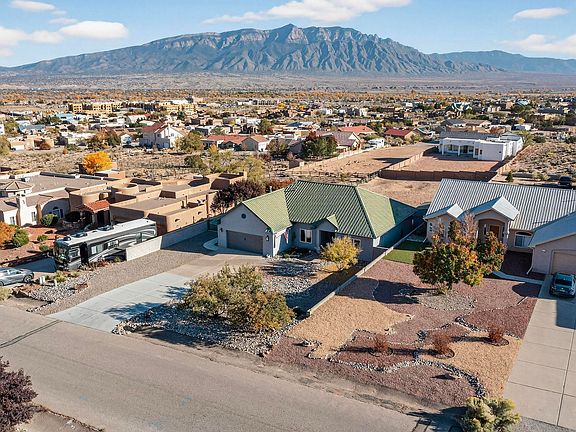 Take in breathtaking Sandia Mountain views from just about every room in this beautiful custom home on a generous 0.5 acre lot. Thoughtfully designed with two inviting living areas, sleek quartz countertops, and beautiful laminate wood flooring. Step outside to a backyard patio perfect for entertaining, where you can relax and enjoy the magnificent mountain views. Additional features include a refreshing splash pool, side yard access, and extra-wide doors for enhanced accessibility. Blending comfort, style, and functionality, this home shines in one of Rio Rancho's most desirable neighborhoods--a truly exceptional place to call home.