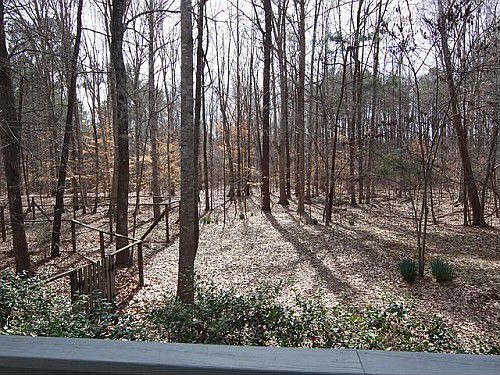 Complete info: http://6813falconbridgerd.ePropertySites.com - MOTIVATED SELLERS.. Well maintained JP Goforth contemporary home in desirable Falconbridge neighborhood of Chapel Hill. Gorgeous lot backs up to 365+ acres of protected Jordan Lake watershed with walking trails. Efficient floor plan with downstairs master bedroom. Two large bedrooms upstairs with buddy bath. Separate sink & toilet, shared tub/shower. Large living/dining room combination with woodburning fireplace. Separate office downstairs; perfect for telecommuter or in home business. Freshly painted interior. Brand new carpet throughout. Exterior painted in 2008. Crawlspace sealed by the experts at Advanced Enery, A sealed crawl space prevents mold & moisture problems (which also minimizes pest issues) and is more energy efficient. Heat pump replaced in 2007. Water heater in 2009. Huge deck with built-in seating overlooking wooded back yard. Fenced area for pets. Lots of storage in attached 8 x 8 area plus under eaves upstairs. Energy efficient Pella windows. Nearly new Maytag Bravos digitally controlled washer/dryer conveys.