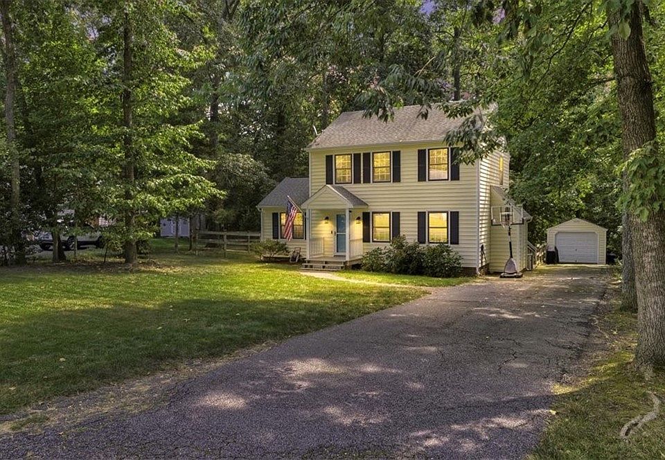 Welcome to this charming 2 story, 3 bed, 2.5 bath 1,800 sq ft home with detached 1 car garage in the popular Deer Run neighborhood of Midlothian! Inside tile flooring in the foyer guides you through the freshly painted space throughout the home. To the right of the entrance is the living room that features new engineered hardwood flooring and fresh paint. The eat-in kitchen has stainless steel appliances, tile flooring, updated cabinets, and ample space. The adjacent dedicated laundry room with cabinetry enhances convenience. A highlight of the home is the expansive heated sunroom with vaulted ceilings and double ceiling fans, ideal for relaxation or entertaining. Here you can access the fully fenced-in backyard with a playset. There is a hall bath nearby with new LVP flooring, new toilet, vanity and light fixtures. The family room boasts newer engineered hardwood flooring, vaulted ceilings, and skylights that bathe the space in natural light. The carpeted primary bedroom impresses with an en-suite bathroom featuring a new shower insert, vanity, medicine cabinet, and new toilet. There are 2 other carpeted bedrooms upstairs and a full hall bath with tile floor and a tub/shower.