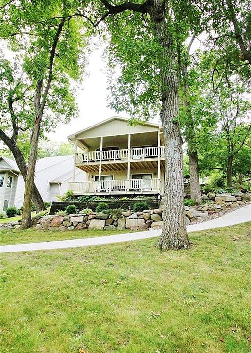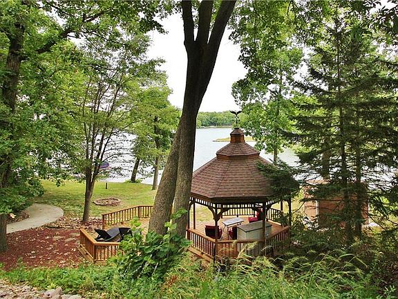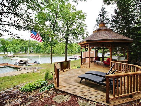 This beautiful waterfront retreat has one of the most welcoming lakeside settings you'll ever see! Located just inside a cove on the lake's west side, the iconic gazebo will have you "made in the shade" OR the sun with a connected open deck - just relax while watching the action from either spot. You'll make memories enjoying the beach, swimming or fishing from the dock, and playing corn hole on the level lawn area. There's even a shed for storing your gear and toys. After a fun day, your golf cart /ATV travels easily up the concrete path to a perfect entertaining spot - picture hosting parties and grilling/dining on one of TWO covered decks overlooking the lake. Amazing! Inside you've got all you need - but not too much to maintain - with three BRs, two baths, open LR/DR/K with beamed, vaulted ceilings, media room with bar, and much more! It's all been lovingly maintained, and the neutral palette awaits your "lake living" personal touches!