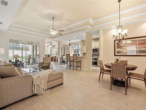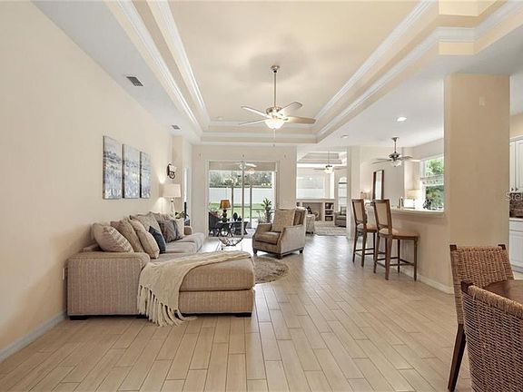 Stunning open-concept 2 bedroom, 2 bath plus den home in a sought-after waterfront, gated community. Light and bright with luxury tile throughout that complements the custom moldings and double tray ceilings. The eat-in kitchen, which includes a breakfast bar, solid surface counters, gas cooking, high end Kitchen Aid appliances and two pantries, opens to a great room AND a living room. The large master bedroom leads to a serene ensuite bath with double vanity, garden tub and separate shower. The den can easily be a 3rd bedroom. A two-car garage (air conditioned), two brick paver lanais, one enclosed and one open, complete this beautiful home. The River Place community includes a clubhouse, heated pool, fitness center, game room, expansive walking trails and a community boat launch.