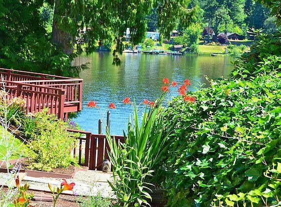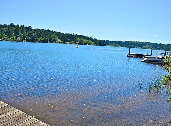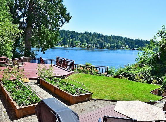 Lakefront Shangri-La. Private dock & nearly an acre of wooded, private land on the west side of Long Lake. Boat launch nearby. Complete architect designed remodel. Custom maple cabinetry, stunning granite counters, mahogany beamed ceilings! Gourmet kitchen with huge island work center & beautiful tiled floors opens to great room with soaring ceilings overlooking the lake, raised garden beds & extensive decking. Opulent top floor view master suite has loft. Upstairs guest bedroom & den/office.