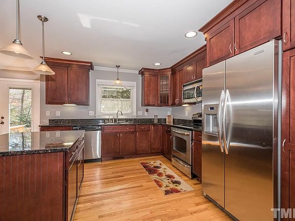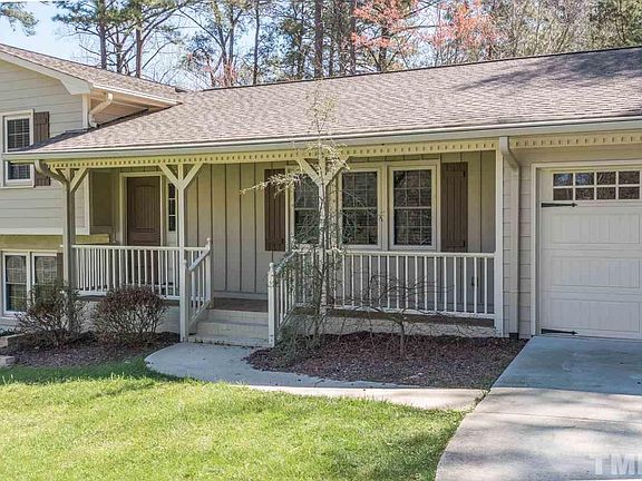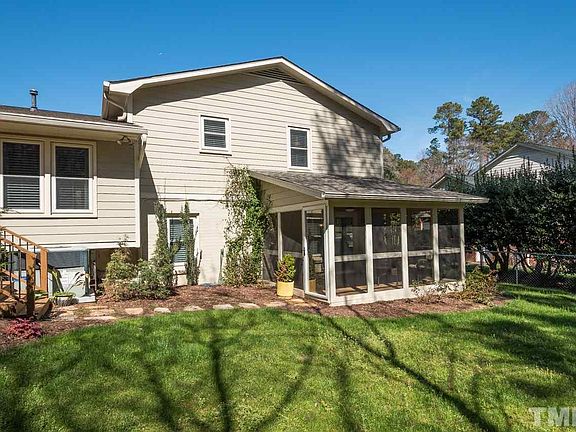 Immaculately maintained & updated home in North Ridge w/screened porch, huge deck, and a large .53 acre private wooded lot! Granite countertops & stainless appliances, hardwood floors, updated bathrooms, separate living/family rooms, new water heater & updated HVAC system! Spacious garage w/separate storage room, large laundry room & fenced yard. Amazing location just minutes to shopping, restaurants, movies, Fresh Market & Harris Teeter w/easy access to I-540 & walking distance to North Ridge Elementary!
