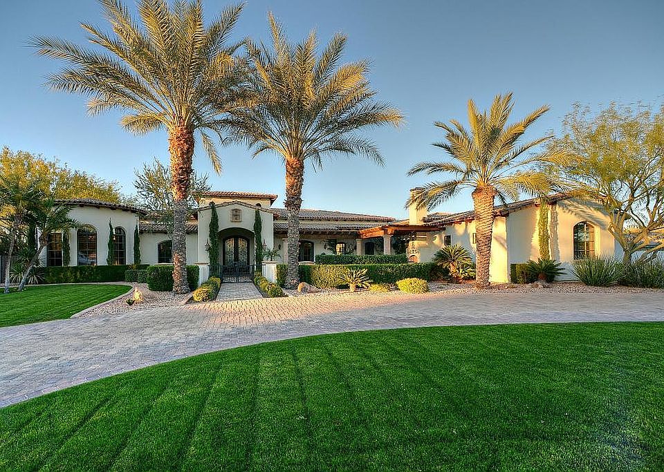 Move-in ready gorgeous Desert Winds Custom home----ideal for family living & very showy for entertaining friends & overnight extended family with a fabulous separate guest house! Tons of curb appeal as you drive up--this Santa Barbara beauty invites you to enjoy w/ the lg. front courtyard then oversized wrought iron double doors welcome you into this stunning home's foyer & formal living room! Entertaining will be a delight with this lg. formal dining room that opens onto the lg. front courtyard thru tall 8 ft. french doors & then onto a sensational ''dream kitchen'' that opens to a huge family room & cheerful breakfast room. This warm inviting family room boasts a lg. gas fireplace in the corner & french doors leading out onto 1 of 3 backyard covered patios & the sensational resort style backyard with a huge pebble-tech pool/spa & water features. Your guest will be very impressed with this awesome backyard boasting a putting & chipping green + lush mature landscape + outdoor BBQ center w/ space for 5 bar stools around the eat-at bar for more outdoor living options! Outdoor fireplace & firepit add night-time ambience to this A+ backyard. Your over-night guests will love their privacy in their spacious sep. guest house. Showy master suite boasts a warm cozy sitting area & another beautiful gas fireplace. Gorgeous master bathroom & sep. exercise rm (currently being used by seller as a "her" office space) & highly upgraded master closet. Your "dream kitchen" features highly upgraded SS appliance pkg. including a Sub-Zero refrig/frzr & 6 burner gas cooktop & Bosch DW. The stunning custom cabinetry makes a huge statement about fine living & yet functionality! Split floor plan w/ master suite & sep. office on 1 side of the home & 3 secondary bdrms (all ensuite) & a kid's game room on the other side of the home. Awesome fully equipped theater room & "Control 4 smart home technology"----this home has it all!! Run---don't walk---to see this beauty!!!