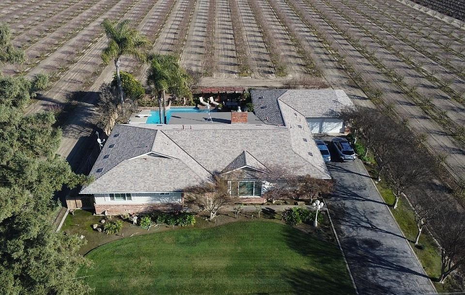 Welcome to this immaculately well-maintained ranch style home located in the serene countryside of Fresno. This home features a spacious formal living and dining room with views of the manicured parklike front yard. The kitchen with beautifully refinished cabinetry, built in hutch with leaded glass doors, Island with cutting board and eating area is all open to the charming family room, boasting a gas burning fireplace insert, decorative ceiling beams, picture shelves and 2 sliding glass doors with views to the relaxing backyard oasis. The primary suite includes a large walk-in closet with modular organizers and on suite bathroom with vanity area as well as another closet. The second bedroom is as spacious as the primary with a large walk-in closet and views of the orchard and pool area. The third bedroom features an enormous closet, wainscoting and sliding glass door access to the backyard. Enjoy the expansive patio that includes a brick outdoor BBQ and plenty of seating for family entertaining. Relax in the newly plastered pool with bench seating and diving board as well as another brick patio area all surround with sturdy block fencing. The detached garage also includes a separate laundry room and secluded space that can be used as storage, office or Game room. Plantation shutters, crown molding and easy-care aggregate flooring complete this stunning home. Upgrades include newer roof, newer HVAC, newly plastered pool, newer well and pump.