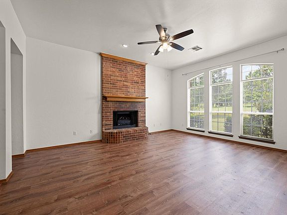 Lots of counterspace and room for bar stools. Equipped with a stainless-steel refrigerator and dishwasher. Large area for a dining room table with French doors overlooking the back yard and large covered patio. All bedrooms and living room have ceiling fans. Master bedroom has French doors going out back onto the large patio, a large walk-in closet and the master bathroom has dual vanities, separate shower and a jetted bathtub. Two secondary bedrooms and hall bathroom are on the other side of the house. Bedrooms have walk-in closets and the utility room has extra storage. This is a rare find.