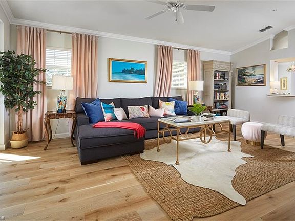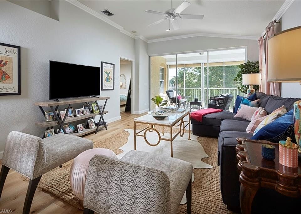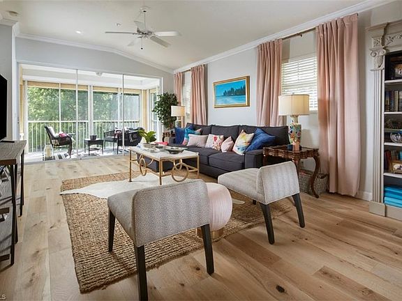 This thoughtfully updated 2nd-floor corner unit has it all! Natural light floods through every window as you enter this 2 BR + den, 2 BA residence boasting vaulted ceilings, 2 living spaces, spacious eat-in kitchen w/ pantry, formal dining room, Legno Bastone wide plank wood floors, crown molding and generous screened lanai that overlooks the lake and landscape. This unit is the perfect candidate for the "lock and leave" lifestyle, or the savvy investor looking for a rental in a great location for their portfolio. Hurricane ready w/ electric storm shutters that enclose the entire lanai. The den can easily be converted into a 3rd bedroom. Residents of Calusa Bay enjoy the finest amenities and an ideal location - 16 acres of stocked lakes, over-the-lake sun deck w/ attached 80-ft fishing pier and gazebo, 1.25-mile nature walk, 21 meter lap pool, 2 cabana pools, clubhouse w/ a full kitchen and library, fitness center, lighted clay tennis courts and more. Buildings have new roofs and will be painted in neutral colors. Calusa Bay is located 1-mile from the Mercato Shopping Center and 2-miles to the popular Vanderbilt Beach. Located in one of the most desirable school zones in Naples.