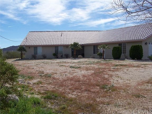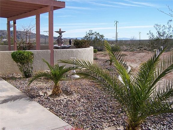 Impressive panoramic views is one of the crowning glories of this home. Sitting just outside the Joshua Tree National Park is this tiled roof 3 bedroom, 3 bath spacious home. Open floor plan provides great entertainment area and inclusion. Fireplace in living room. Large kitchen with plentiful cabinets and counters. Built in bench seating complete with custom table. This home was constructed thru CALVet financing, all ADA approved. All bedrooms are large and master has walk in shower and extra wide door entrance. Approx. 40x40 4 car finished garage with cabinets complete and a full bathroom! Entreating back patio complete with fountain. Concrete sidewalk borders entire home. Over 1 acre of land. Located on a paved road.