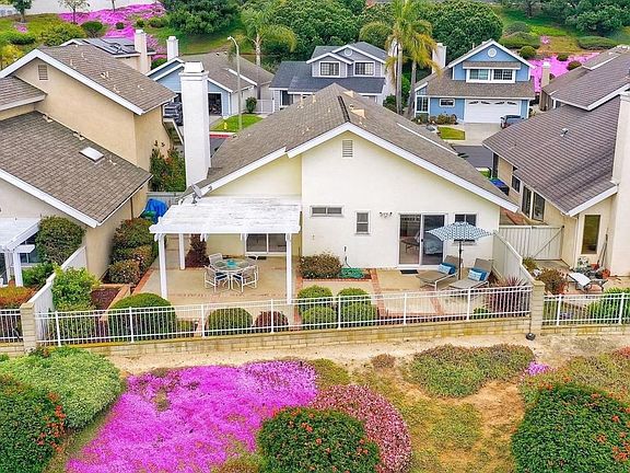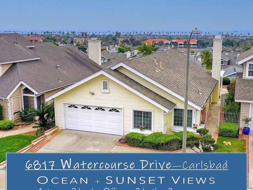 Detached ONE story home with OCEAN & SUNSET VIEWS from the highest street in Harbor Pointe ** This desirable coastal hillside GATED community is less than a mile from So. Carlsbad’s beach campground & within 5 miles of downtown Carlsbad or Encinitas ** 6817 WATERCOURSE DR sits near the end of the CULDESAC & is ELEVATED above the homes below (HOA maintains the beautiful slope) ** Ocean is visible from the Dining, Family, Master Suite & even the kitchen table ** FLOORPLAN LAYOUT (1246 sf) = 2 Bed + Office (or 3rd bedroom option) + 2 Full Bath + Interior Courtyard ** Spacious 2 CAR attached garage (extra room for workshop) ** Community POOL/SPA one block away ** Low HOA & NO Mello Roos ** Pacific Rim Elementary is just a few blocks away