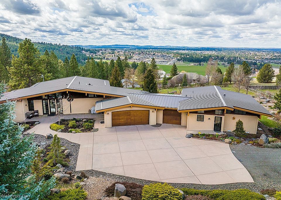 Absolutely stunning views envelop the moment you step into this 4400 sq ft custom contemporary daylight rancher in the country. Situated on 5 acres barely 10 minutes away from South Hill/Valley shopping and restaurants, and steps away from the Dishman Hills Trailhead where you can hike, mountain bike, or ride your horse. Jon Sayler-designed, multi-generational property features completely independent in-law attached home with its own garage. Gourmet kitchens, main-level primary suites, heated floors, vaulted ceilings, and high-efficiency wood-clad windows in both homes. Two-acre deer-fenced portion includes remote-operated security gate, mature landscaping, multiple water features, and rich organic garden soil that will grow anything. Mature fruit trees and berries bring summer goodness to your table. Lower level has 2 oversized bedrooms as well as a family room and an office with 9ft ceilings and ample closets, including storage room accessible from in- and out-doors. In-law unit lower level has exterior-accessible bedroom/office space with its own bath. Work from home with high-speed 5G internet accessibility, you'll never want to leave!