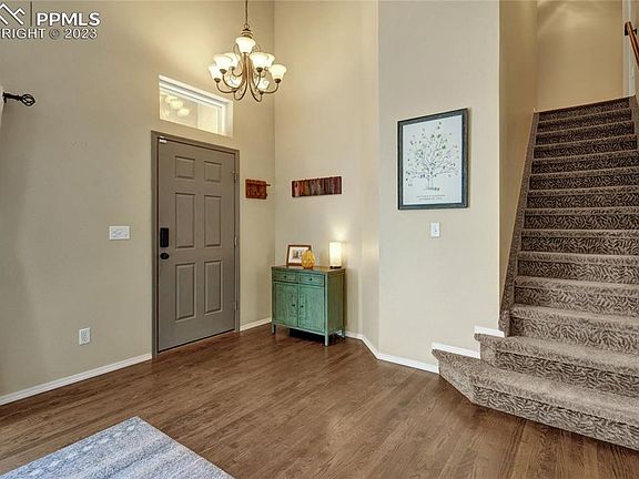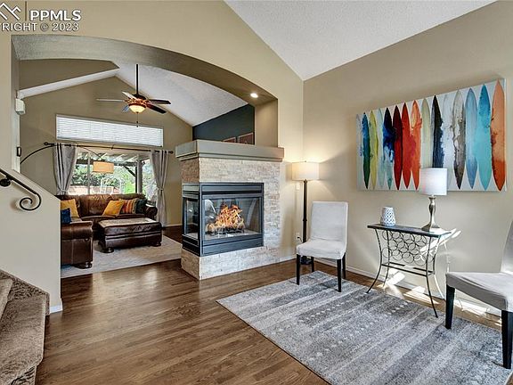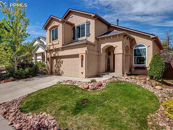 Welcome to this charming 2-story home with 4 bedrooms and 4 bathrooms, in a well desirable neighborhood. As you enter from the quiet cul-de-sac, you'll immediately notice the abundance of natural light that fills the home. The main level features beautiful wood flooring throughout. The living room boasts vaulted ceilings, and a gas fireplace acts as a stunning centerpiece, separating the family and living room areas. The kitchen, dining, and family room are seamlessly connected, providing a perfect space for entertaining guests. Open the door and step out onto the back patio, where you'll find a generous covered deck measuring 20x16. The backyard itself is a true delight, with a working hot tub, a tranquil fountain, and it is fully landscaped. Additionally, you'll enjoy direct access to the community park, tennis courts, and pool through a convenient gate located in the backyard. Upstairs, you'll have wood laminate flooring throughout, continuing the cohesive design of the home. There are three bedrooms, a laundry room, and two bathrooms on this level. The primary bedroom is particularly impressive, with its large windows allowing an abundance of natural light to fill the room, and your very own private view of Pikes Pek! Plantation shutters add a touch of elegance to the space. The primary bedroom also features a luxurious 5-piece bathroom complete with a jetted tub and a walk-in closet. The basement of this home has been fully finished and offers additional living space. It includes a bedroom, a second family room, and a full-sized bathroom. This area is very versatile and you can make it a recreational area or a guest suite. In 2022, this home underwent a significant upgrade with the installation of new, energy-efficient, Champion windows throughout which is a great investment in saving energy. Location-wise, this home is perfectly situated near numerous community amenities and all of that is accessible directly from the back gate of the property.