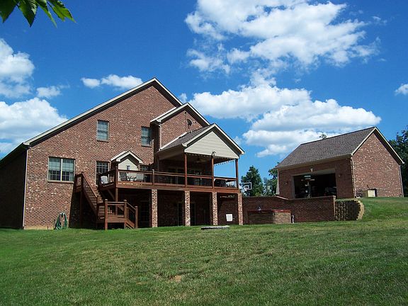 Beautiful all brick home situated on 4.21 wooded acres with access to the community stocked lake and walking trail! Home features a main floor master suite and an additional 3 bedrooms upstairs and 1 bedroom in the basement. Total of 3 ½ bathrooms throughout. Upstairs has a large bonus room and play area. Main level large kitchen features all granite countertops, walk-in pantry and large island. Open floor plan on the main level with the kitchen, dining and family room interconnected. Perfect for entertaining and parties. Full finished walk out basement featuring a brick bar room, family room and exercise room. 2 insulated walk-in attic spaces and lots of closet space throughout the whole home. Home has built in security system, whole house audio and back up generator operated off the 1000 gallon buried propane tank. Quality built 4 star energy rating with pella windows and doors, this home is a gem. Outside you will find a beautiful covered deck overlooking the rear of property. The home backs up to a large wooded area. The back yard is perfect for a large pool! The garage space is over the top! With the attached 30x28 2 car garage and another all brick fully finished and insulated 30x30 detached garage, you will have plenty of space for all the toys! You are minutes from downtown Louisville and located in the coveted Floyd Central School district. This home is a must see!