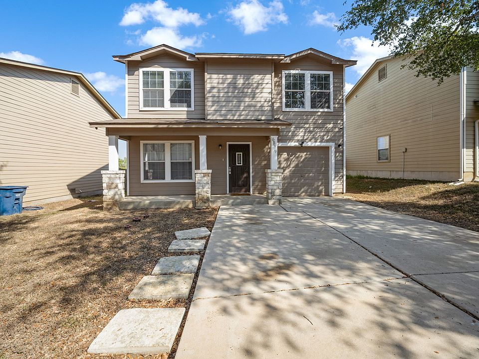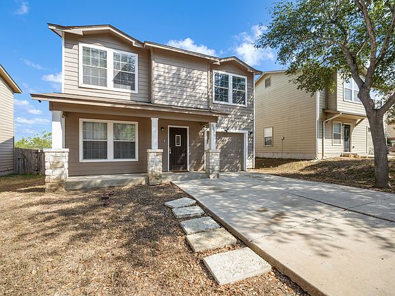 Welcoming 2-story, 3-bedroom, 2.5-bathroom home with a spacious and functional floor plan. The living area flows seamlessly into the dining space and kitchen, perfect for both everyday living and entertaining. The kitchen is equipped with stainless steel appliances, ample cabinet space, and a breakfast bar. Upstairs, youll find generously sized bedrooms, including a primary suite with a single vanity and tub/shower combo, along with a small loft and bonus room that offer additional living or office space. Ceiling fans throughout the home provide added comfort. Washer and dryer are included. Additional highlights include a welcoming front porch, a half bath downstairs for guests, and a large backyard ideal for outdoor gatherings. Easy access to 410 and a quick drive to Lackland AFB. Conveniently located near shopping, dining, and major highways.