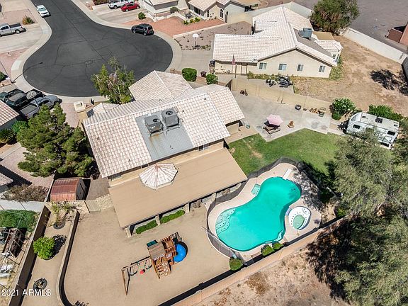 Absolutely awesome cul-de-sac home with a pool on an 11k sq.ft. lot with a 3 car garage, RV gate, and 2 RV hook-ups. And there's no HOA! The inside of the home is just as great! Features include: 4 large upstairs bedrooms; 3 bathrooms; separate living and family rooms; formal dining room; fireplace; washer/dryer/fridge convey as well as the playset in backyard. Hang out on the covered patio or take a dip in the pool because you know the summer heat is just weeks away! Located in a wonderful neighborhood within the Peoria School District. Don't wait, come see it today!