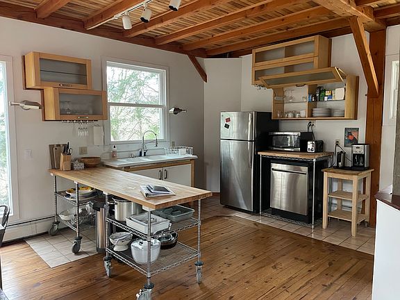 Set back on a private road less than a minute drive to the Manchester Center shops and restaurants, the cabin is nestled in 8 wooded acres that border the Bourn Brook. Our house provides a secluded private setting for reading, enjoying nature or sitting around a camp fire with family and friends. Exposed heavy timber construction creates an industrial loft-like feeling with high ceilings on the main level. Here, two large bay windows provide natural light and cozy places to sit and read or enjoy a cup of coffee watching and listening to nature. The open concept culinary kitchen is a treat for those who love to cook and a large 7' long farm table is an ideal spot to eat, drink and spend time with friends and family. The smell of fresh coffee will follow you up the stairs to the vaulted master bedroom a gallery of windows, green leaves and starlight. The house is situated to take advantage of passive solar - the living areas face east and south while the porch and bedrooms are west and north. Our house is well insulated to keep you cool during summers with radiant floor heating in the lower level and baseboards in every room will keep you warm at night. Availability: Yearly rental starting May 1 with option for a season rental. House is fully furnished and all utilities included except heat (oil) Owner pays for electric, plowing, garbage and lawn care. Renter Pays for heat (oil), cable tv and internet. One month rent deposit. Not smoking of any kind is permitted. Tenant is responsible for taking garbage to road and maintenance.