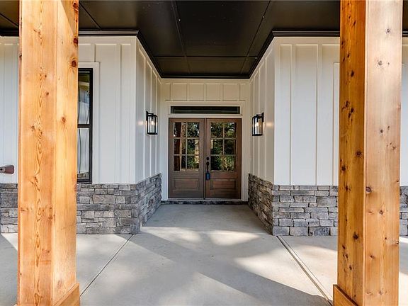 Farmhouse doorsTimeless shaker cabinetsElegant farmhouse-inspired finishes throughoutLarge quartz islandStainless steel appliancesInviting wraparound front porchHardie-plank and stacked-stone exterior
