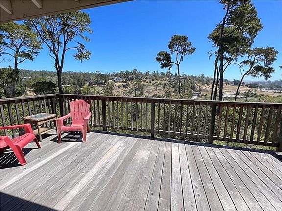 This charming home in the pines overlooks the trees, the West Village of Cambria and is close to the upper trails of the Fiscalini Ranch Preserve. It is a licensed vacation rental with two bedrooms, 2.5 bathrooms, and a two car garage. A deck on each level extends both the open concept living room and the primary suite allowing you to enjoy nature and the fresh breezes of Cambria from both levels of the home. Upstairs in the living areas, the vaulted wood ceilings enhance the large picture windows with the great views of the pines. A half bathroom is conveniently tucked in at the top of the stairs. The living room has a wood burning fireplace, nook for the dining room table and is open to the generously sized kitchen. Both bedrooms are downstairs and have private full bathrooms (the primary is en-suite) and window seats plus the primary bedroom has a large walk-in closet.The home has been recently painted inside and has new carpet throughout. The laundry area is in the garage. Conveniently located to access either the Santa Rosa creek trail which heads into town or meanders along the creek, or to the Fiscalini Ranch Open Space trails with beautiful ocean views. It is also a short but scenic drive to beaches and the West Village.