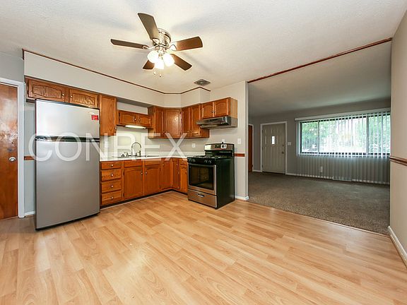 Has an eat in kitchen has a ton of cabinet space, stainless steel appliances.