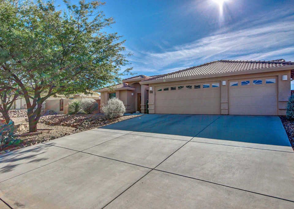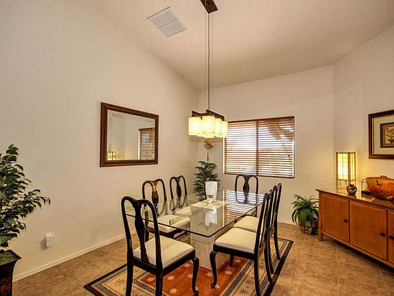 This fantastic home features a heated salt water pool, vaulted ceilings & tile flooring throughout! Roomy kitchen boasts Corian counters with seamless sinks, GE Profile appliances, custom wood cabinets w/ lower roll-out shelves, ample counter space, center island w/ raised bar & breakfast nook. Spacious master bedroom has adjoining bath & private exit to the covered patio. Generous backyard has mountain views, refreshing pool & meticulous desert landscape! Extras include: reverse osmosis, electronic air filtration, gutters, outdoor shades and fans, French doors, gas hook-up for grill, radiant barrier throughout house/garages & painted interior garages with 5' extension. Note: Fountain & Grill in backyard, 7 units of shelves & freezer in garage, & light in the nook DO NOT convey.
