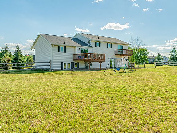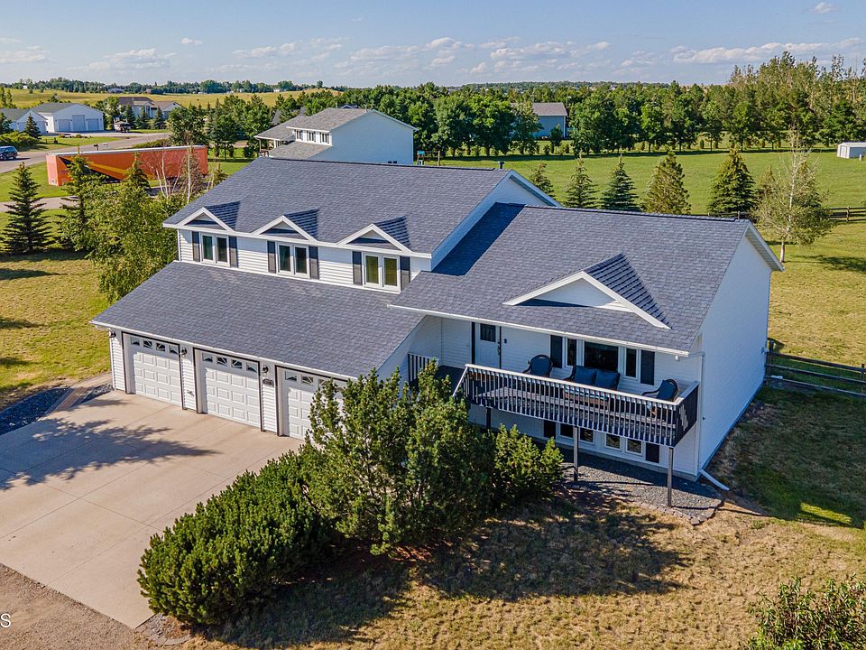 Looking for residential acreage and only minutes from Bismarck? Enjoy mornings on your primary bedroom, private deck and evenings on your patio, dining room deck or front porch deck in this large, 4-level home (3-levels above grade) in NE rural Bismarck! Updated windows, flooring, lighting, and paint! The main level features a large entry with coat closet and vaulted/cathedral ceiling, spacious living, kitchen with black stainless-steel appliances and dining with access to the deck. The upper level has three bedrooms, including an XL primary bedroom suite with patio door/deck, two additional bedrooms and full bathroom with laundry. The lower-level features 2nd living room space with sliding door to the patio, half bath (with large closet) and entrance to the 3 stall heated garage. The lowest level features daylight windows, third living room, 4th bedroom, 3/4 bathroom, storage room and utility/furnace room. The +/- 1.49 acre lot features established trees (including evergreen and apple trees), split-rail fence, shed, and space for a future shop. Located in Country North Estates just east of the 71st Ave NE/Centennial Road interchange curve. Property has audio/video surveillance.