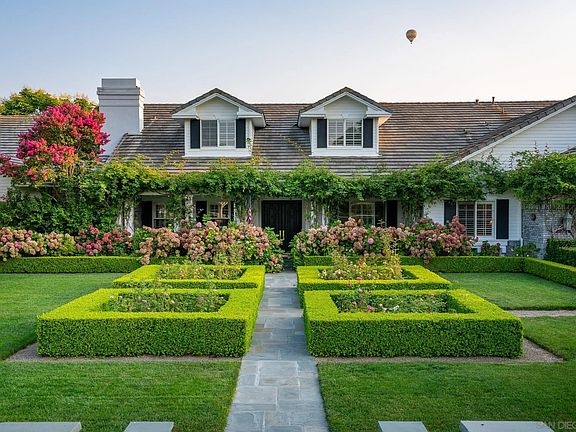As you stroll through the magnificently landscaped English Garden, you approach a beautiful Manor, situated on a cul de sac, of 1.22 acres. Rancho Santa Fe Lakes is a Private Gated Enclave and home to this architectural masterpiece. Cape Cod meets Rancho Santa Fe. 5 bedrooms, 51/2 baths, the custom double door front entryway guides past the living room, dining room and onto the open kitchen and family room. There is an abundance of natural lighting and beauty provided by the private lush landscaping. Custom cabinetry and appliances afford a culinary dream come true, with plenty of storage and space to gather together. The main bedroom en-suite has a double door entry, fireplace and sitting area with view. The main bedroom en-suite has a double door entry, fireplace and sitting area with view of the private garden. Two separate walk-in closets allow for plenty of hanging and storage space in the private bath area. A spa-like atmosphere is created with a separate shower and soaking tub. The secondary en-suite bedrooms are located at the opposite end of the home, allowing the master suite to have maximum privacy. Bedroom 4/5 functions as a separate guest suite, with its own outside entrance off of the front porch, as well as from the main home. The large upstairs bonus room, approximately 1204 SF of living space with its own bathroom, functions as a multi-purpose game room / flex room or private bedroom suite. Just outside the family room is a large 377 SF enclosed rear sunroom that will allow you to thoroughly enjoy the inside / outside feel. The rear yard is a well-designed sanctuary that includes a unique and ample closely cropped lawn for croquet, bocce ball or entertaining, and a separate children’s playhouse. A cozy potting shed complements the mature landscaping and over a dozen orange, lemon and grapefruit citrus trees. The pool and spa area is its own secret garden, surrounded by a lush tall privet hedge and set behind private gates. Step inside and leave the rest of the world behind.