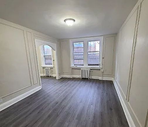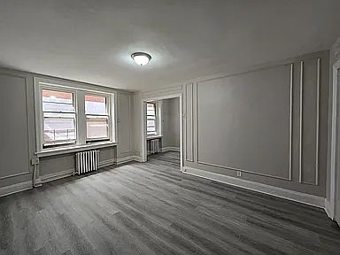This recently renovated apartment blends modern upgrades with a touch of classic architectural detail, making it highly attractive to renters. The entire unit features brand new gray plank flooring and is freshly painted in a pleasing light gray, providing a contemporary, clean canvas. The living area is especially charming, showcasing attractive decorative wall molding and large windows that let in plenty of natural light. The kitchen is fully updated with sleek, dark gray cabinetry, a subway tile backsplash, new marble-look countertops, and a stainless steel gas range and refrigerator. The bathroom has also been refreshed with a new modern gray vanity and a new toilet, while keeping the classic white tiled bathtub surround. This unit is perfect for tenants seeking a cozy, updated home that's ready for immediate move in.