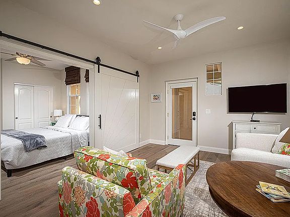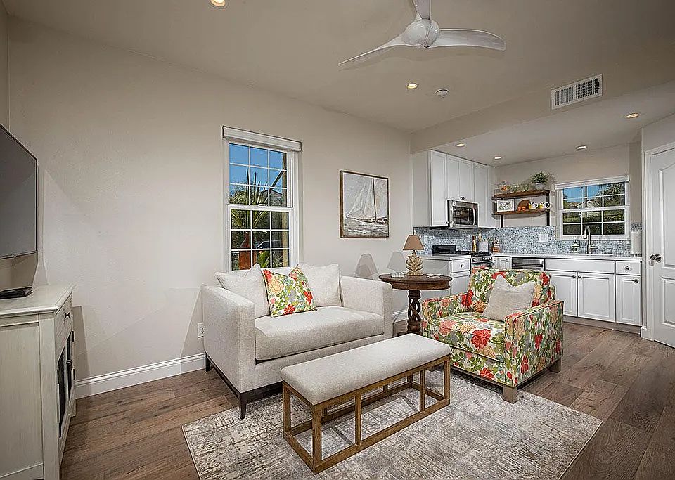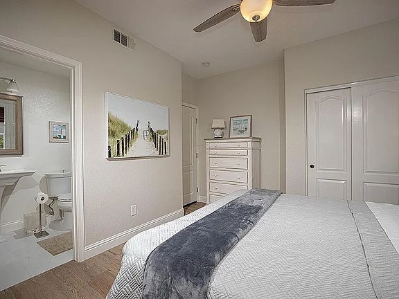 Welcome to the Sweet Suite, conveniently located on a beautiful, quiet street in Carlsbad's most sought after neighborhood, La Costa Greens. It is completely and exquisitely furnished - designer bath with walk-in shower, pedestal sink and comfort-height toilet. The bedroom, with a king-size bed, is separate from the living room and kitchen. The bright, contemporary kitchen has recessed lighting, all new appliances, including a refrigerator with bottom freezer, gas stove, dishwasher and built-in microwave with stacked washer and dryer in the utility closet. Utilities are included. Rooms are light and airy. Ceiling fans are in in both bedroom and living area. Keyless entry. Kitchen stocked with dishes, needed pots, pans, utensils and coffee maker. HVAC is managed by the owner. There is parking for one car on the street. No smoking allowed inside
