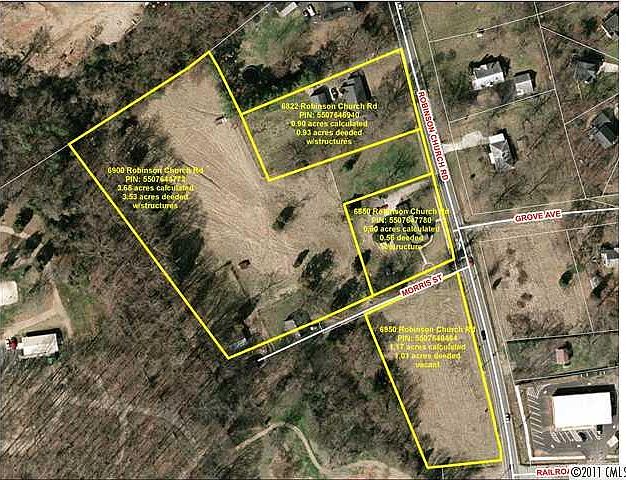 This is an assemblage of 4 parcels: PIN's: 5507646940 - 0.93 acres w/2 structures @ 6822 Robinson Church Rd & 5507644772 - 3.53 acres w/ 3 structures @ 6900 Robinson Church Rd & 5507647780 - 0.60 acres w/1 structure @ 6850 Robinson Church Rd & 5507648464 - 1.01 acres w/no structures @ 6950 Robinson Church Rd (Total Property = 6.02 acres / 4 adjacent parcels w/6 structures).