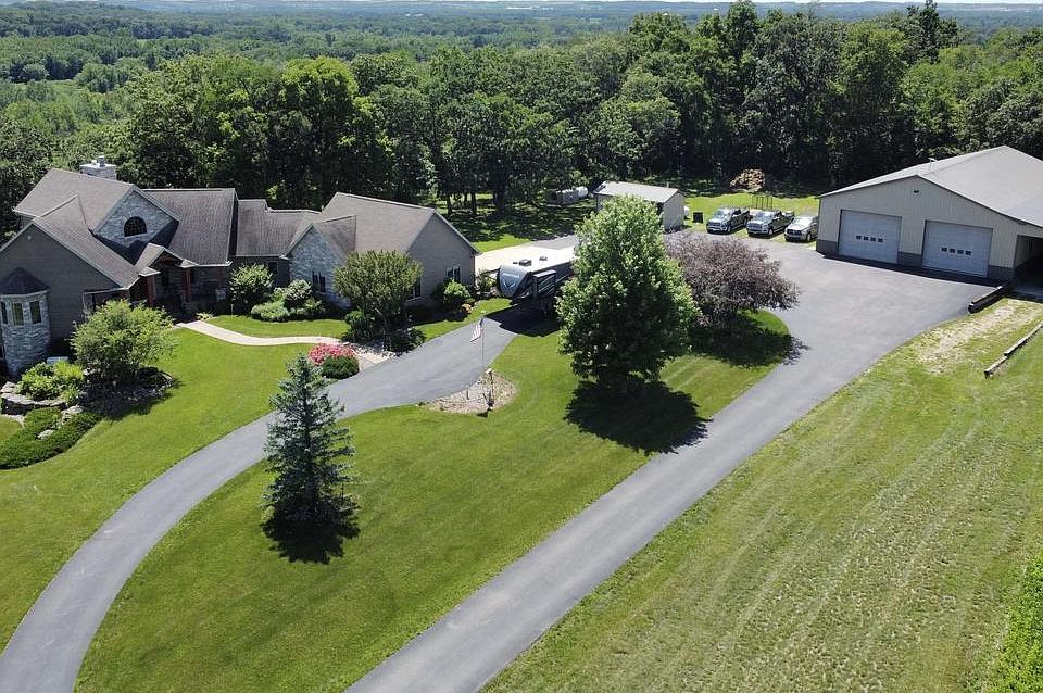 Nestled into the beautiful backroads of Brodhead lies 55 acres of possibilities. At the top of the perfectly paved driveway you will find a rare 4285 sq ft timber framed home, timber imported from Canada. Home includes an walkout L.L. with access to a motorcycle garage, wine cellar, 2nd kitchen & living area. On the main level you'll enjoy the desirable open concept layout with a grand staircase leading to the loft office. Main level also includes eat in kitchen, formal living with a cozy FP & a large bedroom suite to suit your needs. Entertain in the outdoor kitchen & wrap around deck with unimaginable views overlooking all your land. The convenient heated shed means no more excuses in the Wisconsin winters! Economical utilities with wood burning furnace. 100% handicap accessible!