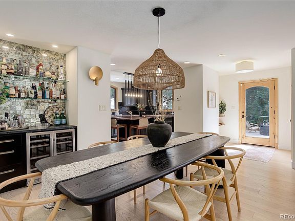 - Description: Open Dining Room With Custom Dry Bar Complete With French Door Wine Refrigerator, Storage, Soapstone Countertop, And Tiled Backsplash, Kährs Wood Flooring