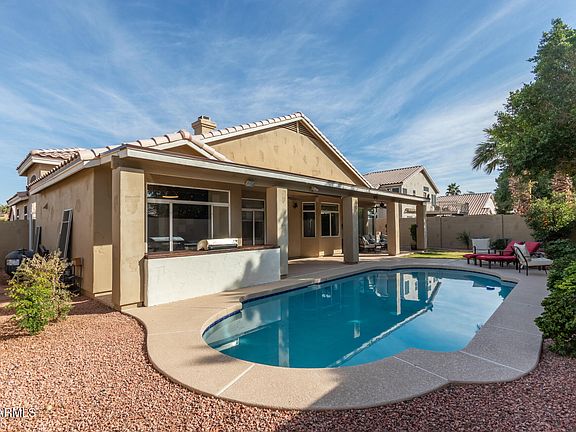 Welcome Home! IF... you are looking for a BEAUTIFUL, single-level home, with 4 bedrooms, a Pool, a 3-Car Garage with Built-In Cabinets AND an RV Gate with slab for additional parking, then LOOK NO FURTHER! But wait... there's more! When you drive up, you'll be impressed with the look of the stacked stone exterior. Walk in, and you'll find a ROOMY Living/Dining area, SPACIOUS family room, and a kitchen featuring granite counters, island, and TONS of cabinetry! More? How about a CLASSY primary bathroom with tile-surround shower and separate bathing tub. Go outside... and you'll see an EXPANSIVE covered patio, BBQ, SPARKLING play pool, ceiling fans and grass area. Add in a NEW A/C and Patio Roof (2024), newer tile roof (2016), & Ref/Wash/Dryer all stay, and you have just found YOUR new home! Evap Cooler in Garage