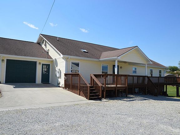 This property is perfect for year-round or vacation living, and can accomodate large gatherings. The spacious home features an open floorplan with vaulted ceiling and lots of light. The wrap-around main-level deck and lower-level patio expand the generous living space for seemless indoor/outdoor living. The home boasts 5 bedrooms, 3 full and 2 half baths. Large living and family rooms, 2 kitchens, 2 laundry rooms, huge work shop, main level garage with built-in storage, plus floored attic space. There is also an attached boat garage. Also featured is a community pond with sandy beach and swimming platform. This property shares a dock in the common lakefront area and includes a private center boat-slip.