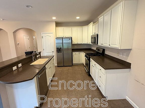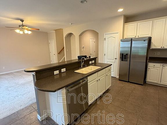 The gourmet kitchen opens seamlessly to the warm, inviting family room and includes solid-surface countertops, a gas stove, stainless steel appliances, and elegant tile flooring. Enjoy the added convenience of a first-floor guest bedroom and ceiling fans throughout.