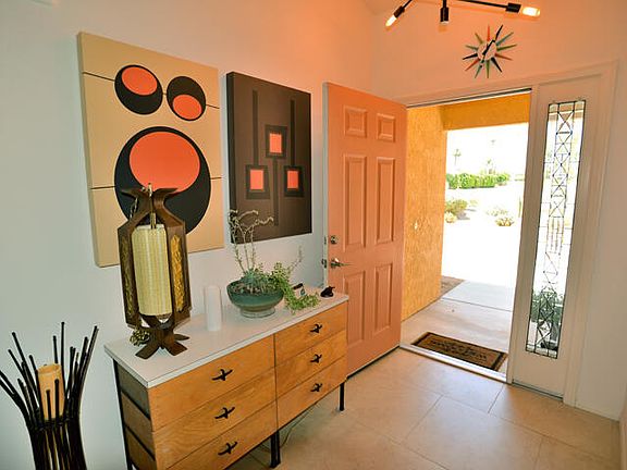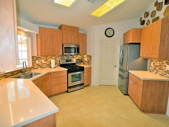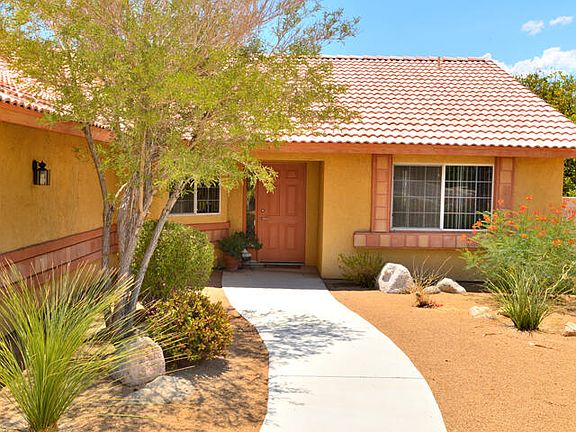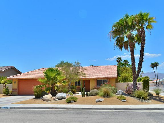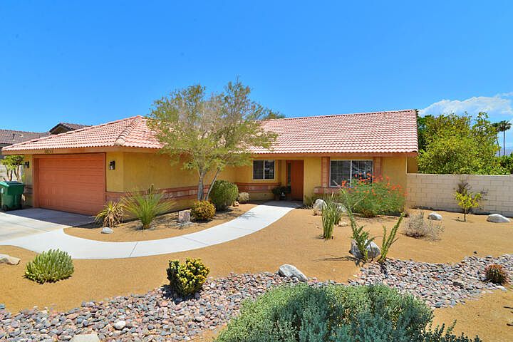 Beautiful Cathedral City home on large corner lot, with low maintenance desert landscaping front and back. The main area of the home has a large, open, living room, dining room, kitchen combination with vaulted ceilings and 24' porcelain tile floors. Kitchen has updated cabinets, quartz countertops and mosaic tile backsplash with attached laundry room. Living room has direct access to the backyard with large covered patio, 10 X 40 sport pool and incredible mountain view's, truly an entertainers dream! The large main bedroom features vaulted ceilings, direct access to the covered patio and a private 5 piece bath with updated cabinets, tile floors and a large walk-in closet. The secondary bedrooms are located on the opposite side of the home, both with vaulted ceilings, the larger having direct access to the covered patio. The home also features newer HVAC system, rolling shutters on the three sliders which provide cooling assistance during hot summer days and a leased solar system which helps with energy costs. This one won't last long, schedule an appointment today!