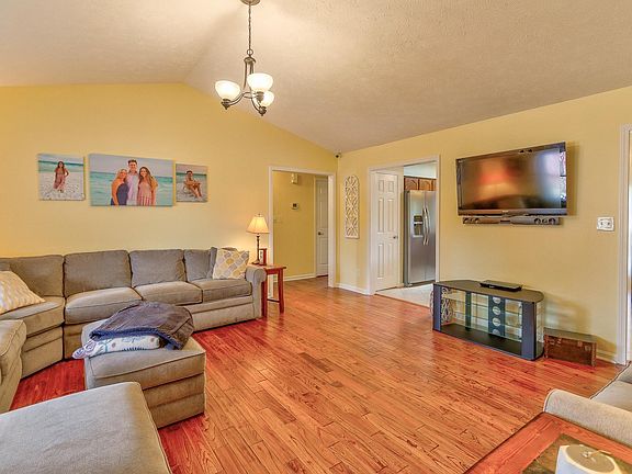 Welcome to this inviting 3 bedroom, 2 bathroom ranch-style home nestled on Evansville’s east side in Audubon Estates. As you enter, you’re greeted by a spacious living area with vaulted ceilings that create an airy, open feel. The kitchen features a skylight, breakfast bar, stainless steel appliances, and a designated area for dining. Located just off the kitchen is the primary suite, offering a generous walk-in closet and a private ensuite bathroom. Two additional bedrooms share a full bathroom, while the laundry room is nearby for added convenience. Outside, enjoy a large covered deck that’s perfect for entertaining, overlooking the fenced backyard and a relaxing hot tub – an ideal space for making memories!