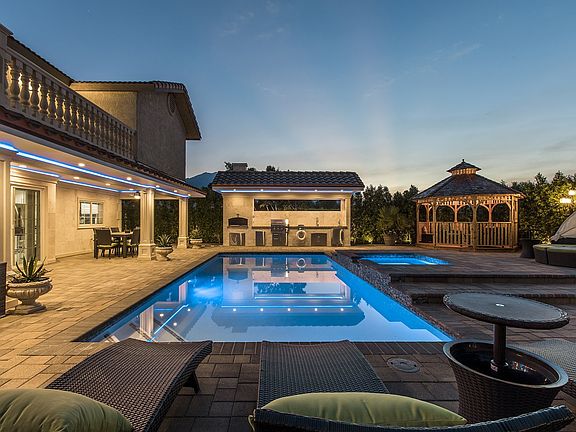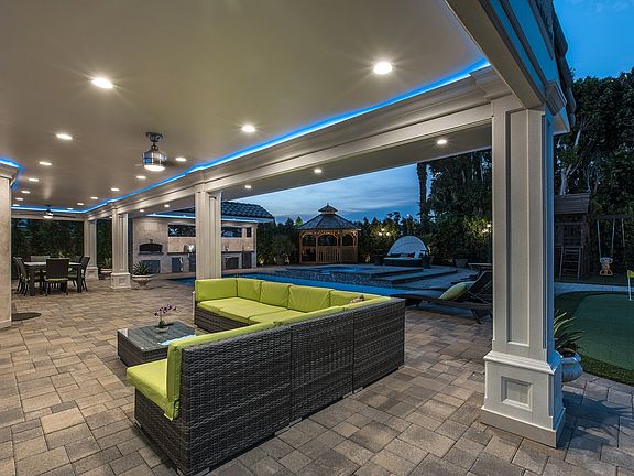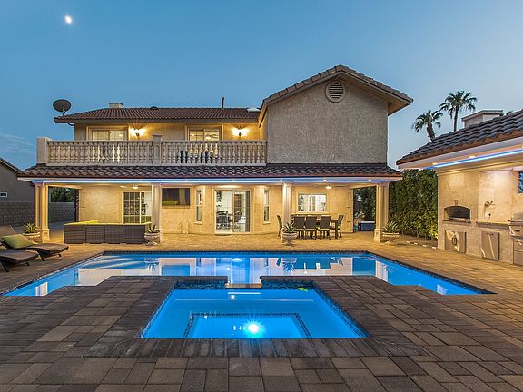 Indulge in the luxurious, fully furnished, Verano Resort nestled in the heart of Cathedral City, where opulence meets tranquility. Featuring 5 bedrooms, 3 bathrooms, and a large 2,917 sqft floor plan. Immerse yourself in the sophisticated ambiance of this monochromatic haven, adorned with lavish Italian marble throughout the sprawling open floor plan. Relax and unwind in one of two living room/lounge areas, equipped with state-of-the-art smart TVs, featuring a selection of your favorite streaming services, including HBO, Netflix, Hulu, and YouTube. Prepare sumptuous feasts in the cook's kitchen, complete with high-end stainless-steel appliances, a wine cooler, and a magnificent center island that comfortably seats twelve guests. This gourmet kitchen is fully stocked with elegant dinnerware and utensils, creating a delightful dining experience for you and your guests. Slip into the plush pillowtop beds in each bedroom, and enjoy your favorite movies or shows on the LCD TVs. Luxuriate in the en-suite, boasting a grand shower, a soaking tub, dual vanities, a walk-in closet, and a private balcony, overlooking the mesmerizing pool area. On a 10,454 sqft lot, the backyard is a private oasis, surrounded by lush landscaping and majestic trees, providing the perfect setting for an unforgettable retreat. Take a dip in the computer-controlled pool and spa, illuminated by enchanting LED lighting. Savor mouth-watering cuisine, grilled to perfection on the gas BBQ or wood-fired kabob grill, in the gourmet outdoor kitchen. Dine al fresco, beneath the stars, in the outdoor dining area, accommodating up to ten guests. Cozy up by the fire pit, watch your favorite movie or game on the large flat-screen, or engage in some fun on the children's play set, putting green, quarter-sized lighted basketball court, or take a refreshing shower outdoors. End the day in style, gazing at the breathtaking gazebo, or retire to one of the many local golf courses, resorts, shopping, and restaurants. Welcome!