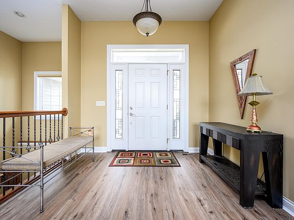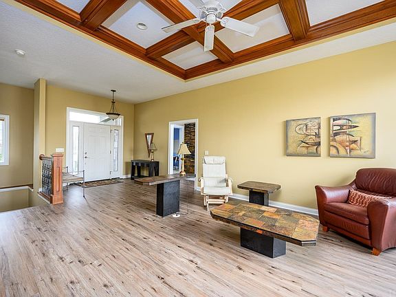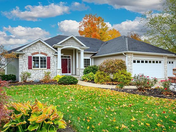 Rare and desirable 5 bedroom custom ranch on walk-out lower level. Custom built by Quality Crafted Homes. Outstanding water lot with breathtaking views. An open floor plan gracefully blends all the main living areas. Warm and inviting kitchen and hearth room with breakfast bar, stainless appliances and 3 sided fireplace with a full wall of windows. Primary en suite includes heated floors, double sink vanity, massive tiled shower and water closet. Superb finishes include custom Harlan Cabinetry, wood coffered great room ceiling, deluxe stained mission style doors, niches and ledges, custom window treatments and central vacuum. Incredible walk out lower level with 2nd FULL kitchen/bar, media room and 2 additional bedrooms. Practical highlights include 3 car garage with hot and cold water, vacuum and floor drains. Two oversized walk in laundry rooms (lower washer and dryer remain/not warranted). Full irrigation system to maintain the custom landscaping. Spectacular stone patio and stairs overlooking the water. Walk in closets. Luxury Vinyl Plank flooring. Anderson windows. Floored attic for additional storage.