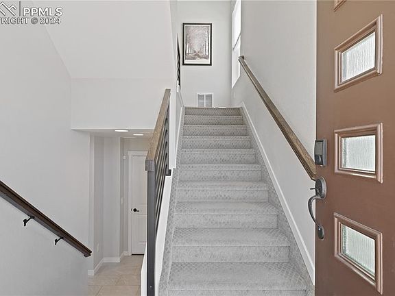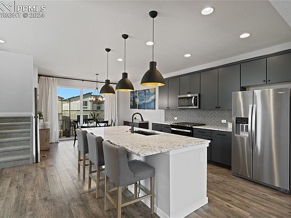 A "MUST SEE" urban contemporary style home nestled in a picturesque setting with breathtaking views of Pikes Peak, Almagre, Cheyenne Mountain and more from multiple areas in the home. This 2-year-old home offers a perfect blend of modern design with all the extra features, providing a luxurious and comfortable living experience. As you enter the home, you will find an open concept main level that seamlessly flows from the living room to the kitchen and dining area. 9-foot ceilings and large windows allow natural light to fill the space and creates an inviting atmosphere. Maple cabinets, granite countertops and island along with luxury laminate flooring make a beautiful area to entertain guests. The adjacent balcony/deck offers a perfect spot to sit, relax and take in the stunning views of Pikes Peak and the mountain range. The home boasts 3 bedrooms, 2 with their own en-suite bath and walk-in closets. On the lower level you will find another bedroom with their own space for a guest with a bathroom as well. The two-car garage provides ample space for storage and has plenty of room for more than just vehicles. This home is designed for low maintenance living, with modern amenities, high-end finishes throughout, and smart home features including lights, garage, front door locks and a ring doorbell. Don't miss this opportunity to own this beauty of a home with spectacular views, plenty of green spaces, close to shopping, restaurants, and trails!