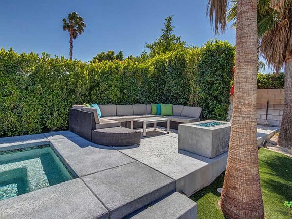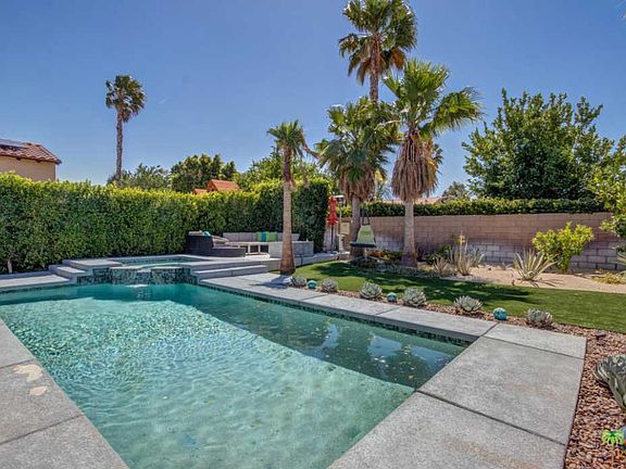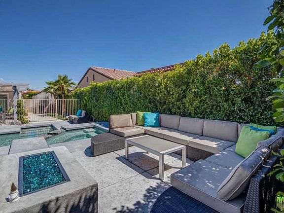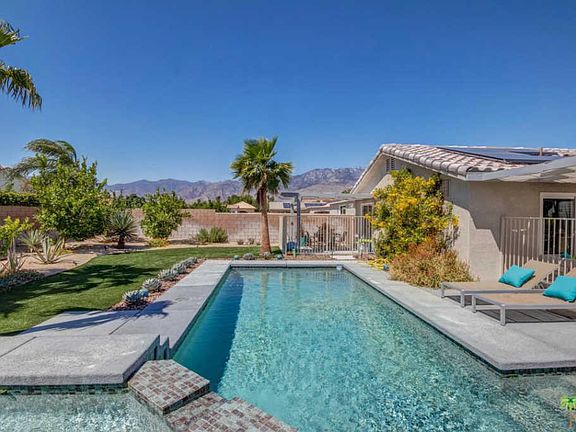 WOW! Check out this ULTRA-MODERN home with DESIGNER FINISHES that has 4 bedrooms, 3 bathrooms, high ceilings, an open floor plan, and a large south-facing backyard that delivers an INCREDIBLE pool and spa with PANORAMIC mountain views! THIS ONE IS A WINNER! Newly installed roof, ultra-high energy efficient HVAC unit, pool/spa equipment, and solar panels that have been paid for by the seller. Stunning light and bright kitchen styled up with modern cabinets, quartz counters and stainless appliances opens to the dining and living area that includes vaulted ceilings, fireplace and tile flooring. Easy access to the covered patio and resort-style pool and spa, too! Two Master Suites, each with their own private spa-like bathrooms, have sliding glass doors that open to the backyard. Bedrooms Three and Four are close to a hallway bath. Inside laundry room plus attached two car garage with storage. Dedicated area for RV parking, too!