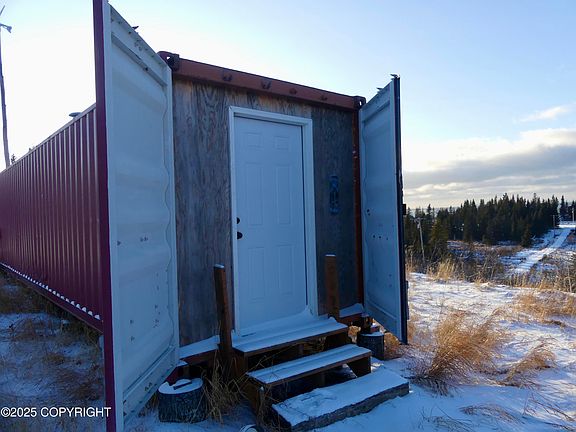Just what you are looking for! Five acre property with 80 acres of Borough land behind it offers both privacy, access and a beautiful inlet mountain view. Conex is converted into cabin or tiny home. Perfect for a summer get away or build your dream house on the hill. Set up for off-grid (wind and solar), but grid is nearby. There is even a spring on property for washing (not used for drinking).