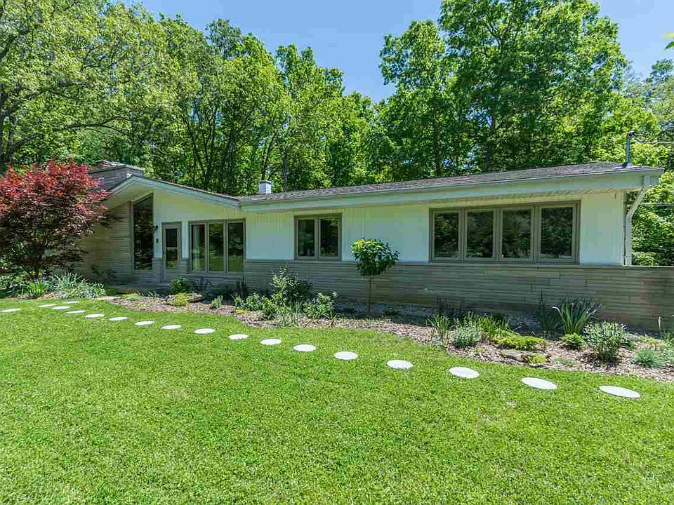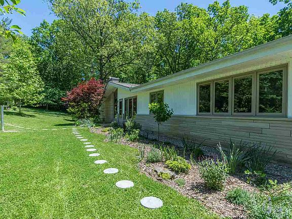 This attractive mid-century modern home on 6.77 acres in the woods has a fantastic setting and is just minutes to the Indiana University campus. Enjoy the mature trees from this ranch over walk-out lower level with vaulted ceilings, hardwoods, corner fireplace, limestone exterior accents, and extensive deck and patio areas with marvelous views of the raised bed gardens. Great care was taken on updating this architectural home with spacious kitchen, dining room, updated lower level, rebuilt chimney, trenching and waterproofing, water heater, maniblock water system, new plumbing, high-end distributed Mitsubishi heating and cooling system, and lovely new landscaping that includes a Magnolia, Japanese Maple, and deer tolerant plantings. Great location on Bloomington's east side on a no through street near College Mall and IU access.