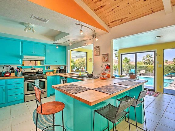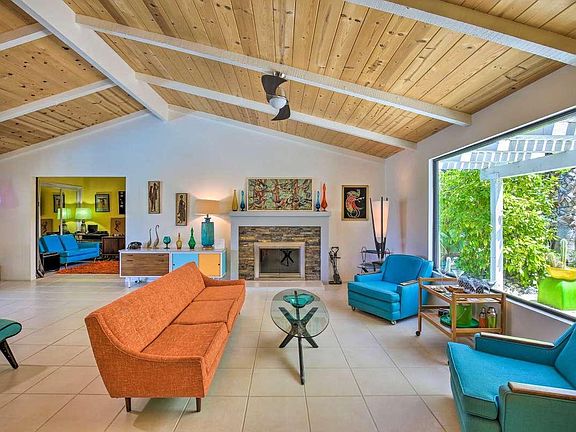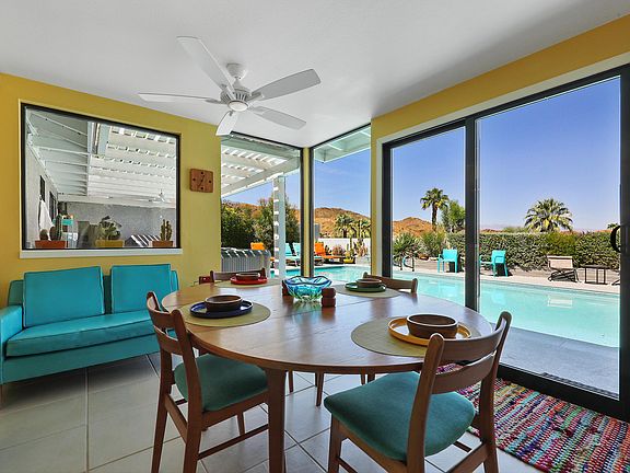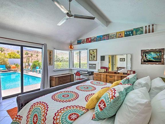 Fabulous interiors and majestic views are just a few of the highlights of this fabulous home. While built in the mid 70s, you get a groovy kind of feeling of mid-century mod the moment you enter the house. A vaulted tongue and groove ceiling and huge picture window in main the living area provides a feeling of space without being overwhelming. A large, open kitchen with loads of storage and breakfast bar are perfect for preparing intimate meals or hosting large groups. The dining area off the kitchen is nearly surrounded by glass providing incredible views of the pool and nearby mountains. With five bedrooms and three baths there's room for everyone. Imagine soaking in some rays while floating in your saltwater pool or relaxing in the above ground spa after a long day. Whimsical colors can be found throughout the house making it feel light and bright. The property is extremely private as it is elevated and surrounded by walls and hedges. Located in the upper Cathedral City Cove, this home is only minutes to Palm Springs and Rancho Mirage for great dining, entertainment and outdoor activities. Plus, there's no homeowner's association or land lease.