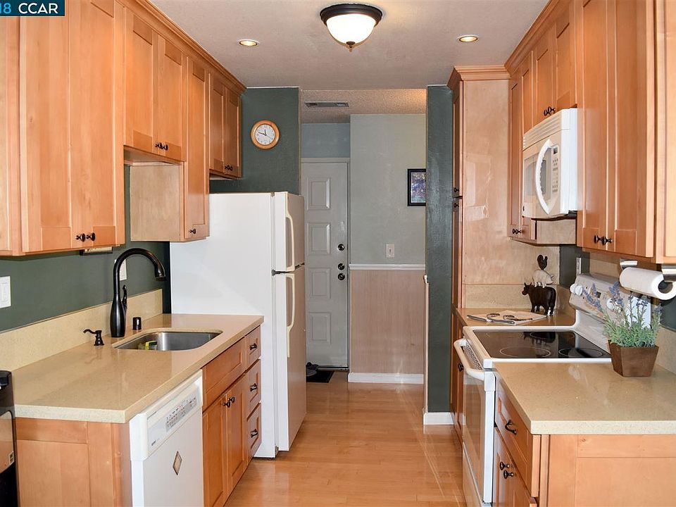 Beautiful upper unit, nicely updated and well maintained. Fireplace and vaulted ceilings, inside laundry, additional storage with pull down stairs in ceiling. Extra deep closet for additional storage in bedroom. Carpet and hardwood flooring, quartz countertops, newer washer/dryer. Trek decking on terrace that overlooks a beautiful green setting. Great locations close to shopping and freeway access.