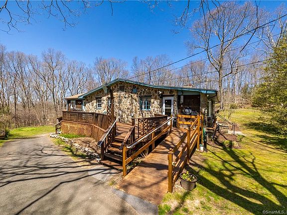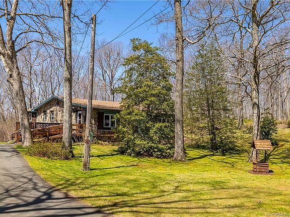 Country roads bring you home to this charm filled stone cottage in the woods! Commune with nature from your own deck! 2.3 acres is a privacy seekers dream come true! Driving up you'll notice the wrought iron fence along the road, and set just back is this sweet home! Outbuildings galore for gardening tools, wood for the fabulous fireplace or how about a few chickens? Spacious deck is the perfect place to relax and unwind and enjoy the tranquility of country life. Step inside and feel cozily at home in this open living space. Efficient kitchen, dining area and living room with a HUGE stone fireplace! 2 spacious bedrooms share a hall bath and then there's a newer great room addition with vaulted ceiling, skylights and second full bath- this would make a terrific primary suite if you so choose! The unique character of this home is something to see and you'll love discovering something new at every turn! New roof was installed in August of 2021, new oil tank in 2019, generator hook up and a walkout lower level!